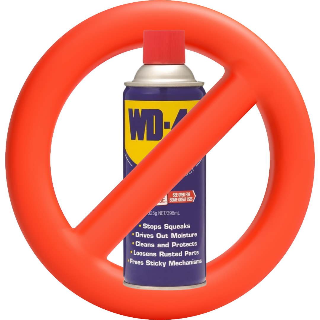 Avoid using WD-40 or other multipurpose sprays. WD-40 is a solvent that removes existing grease instead of protecting it. It may quiet noise temporarily but will leave your door unprotected against rust.